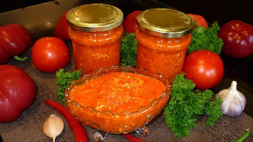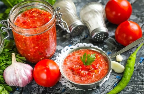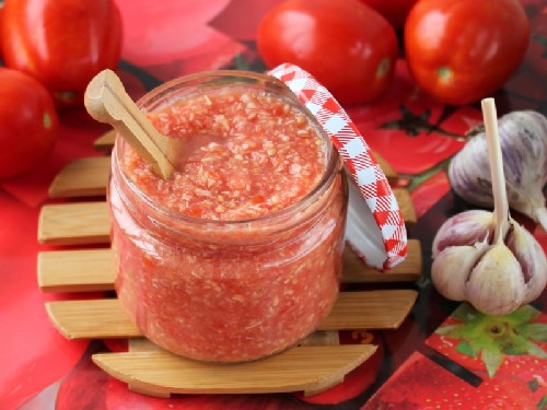 - Kant-en-klare pittig-zoete adjika gemaakt van knoflook en tomaten zonder te koken, kan het hele jaar in de koelkast of koude kelder worden bewaard. Het aperitief is heerlijk met brood of aardappelen, en het past ook goed bij vlees.