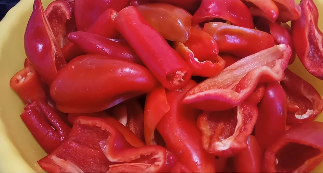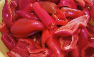 Was rode paprika's en schil ze van zaden en tussenschotten, in reepjes of stukjes gesneden. Verwerk chilipepers met handschoenen; de zaden kunnen worden achtergelaten voor extra scherpte van het gerecht.