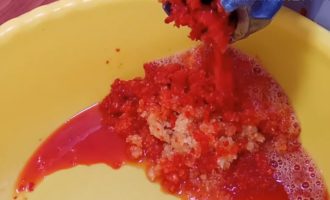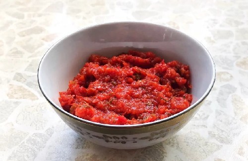- Klop de tomaten in een blender of hak ze in een vleesmolen tot puree. Stuur de tomatenmassa naar een diepe niet-metalen kom en begin dan met het mengen van adjika.