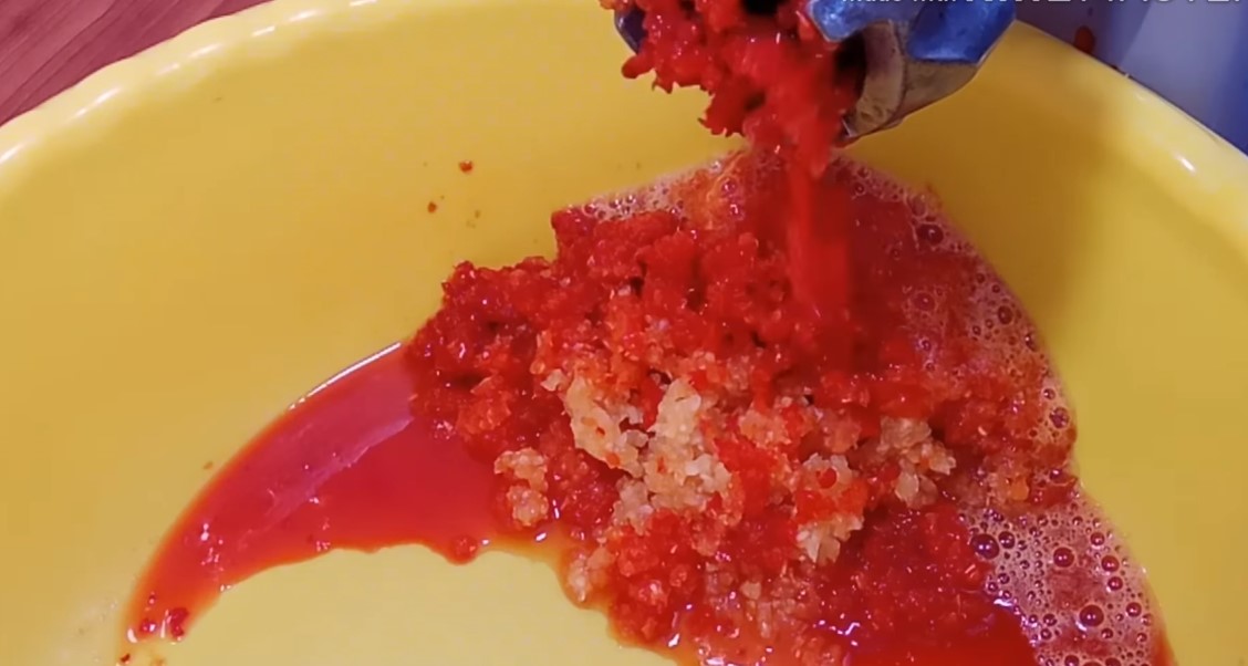 Wrijf de knoflook en paprika samen door een vleesmolen; in plaats van een vleesmolen is een keukenmachine geschikt of misschien een blender. Maal het voedsel in de mate die u lekker vindt en u zich prettig voelt bij het eten van de kruiden.