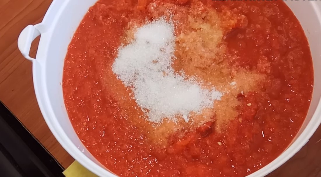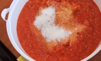 - Voeg gehakte knoflook en peper toe aan een bak met tomaten en kruiden en voeg dan al het zout, de kristalsuiker en de azijn toe. Roer de ingrediënten door elkaar en laat het mengsel een uur in de kamer staan.