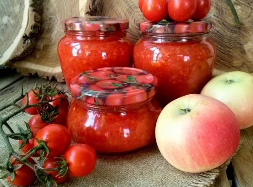 Adjika krijgt een zachtere textuur wanneer tomaten aan de samenstelling worden toegevoegd. Matig pittige en aromatische adjika zal zelfs diegenen aanspreken die niet veel pittige snacks kunnen eten. Rauwe adjika in potten beschermt je immuniteit in het koude seizoen beter dan welke vitamine dan ook.