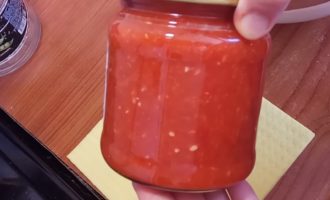 - Terwijl je tomaat-knoflook pittige adjika in een kom wordt gegoten, steriliseer je de glazen potten en deksels ervoor. Verdeel adjika in steriele en absoluut droge gerechten en draai de deksels snel vast.