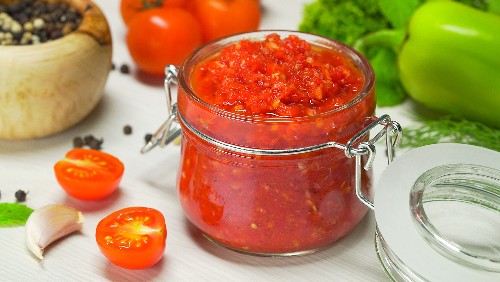- Meng in een niet-metalen bak de tomaat en appelmoes en het mengsel van paprika, kruiden en knoflook. Giet suiker, zout en azijn in de container. Stuur het mengsel van ingrediënten om drie uur in de koelkast te laten trekken, zodat de smaak van de snack verzadigd is.