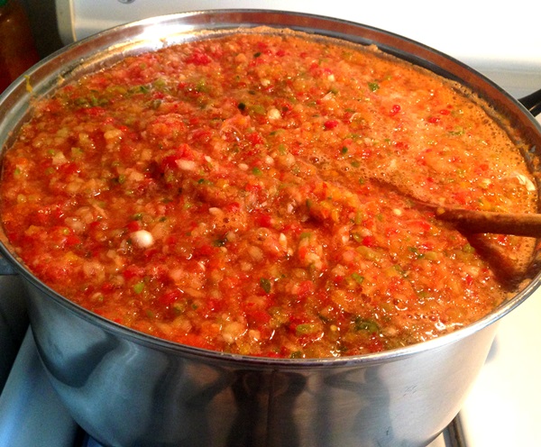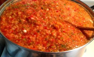 - Giet de resulterende groentemassa in een pan en zet in brand. Wanneer de adjika kookt, moet je het vuur tot bijna het minimum verlagen, zodat het licht kookt. Roer de adjika regelmatig om en na ongeveer 10-15 minuten zul je merken dat deze begint in te dikken. Dit is het juiste moment om de hoeveelheid zout die je nodig hebt aan adjika toe te voegen en alles te mengen.