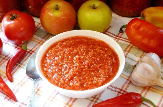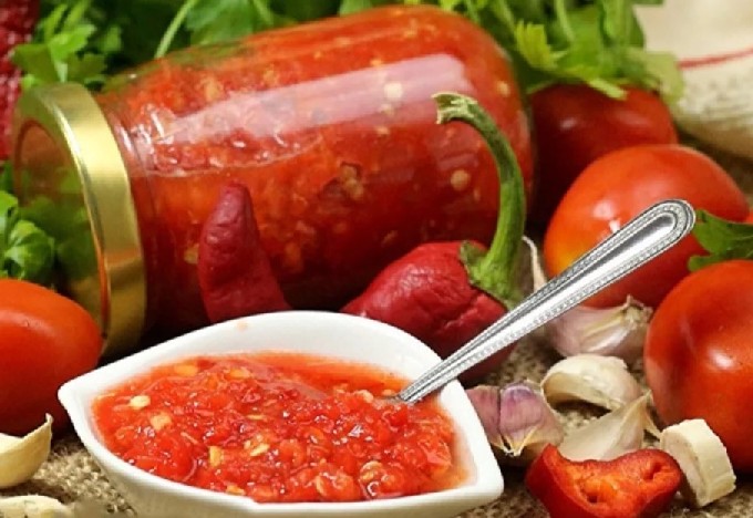 Probeer een hete, pittige adjika te maken van tomaten en knoflook zonder azijn toe te voegen. We verzekeren je dat dit recept je liefde voor altijd zal winnen en een frequente gast op je tafel zal worden.