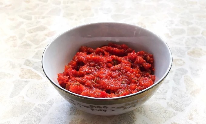 - Nu kun je een theelepel zout, een halve of een theelepel hete rode peper en een eetlepel suiker toevoegen aan de resulterende puree. Meng alles grondig.