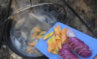 We maken de wortels schoon en snijden ze in blokjes. Uien - in dunne halve ringen. We sturen groenten naar varkensvlees.