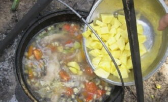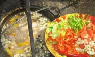 - We snijden groenten op een handige manier en voegen ze toe aan het vlees. Gebruik voor shurpa geen te kleine producten. We blijven nog 5-7 minuten bakken.
