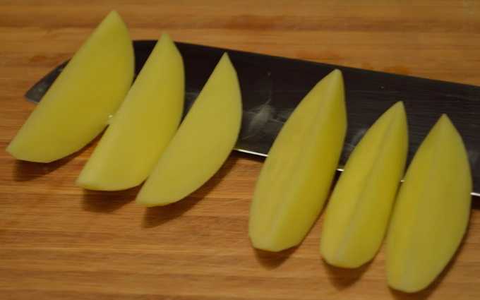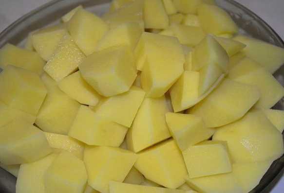 - Schil eerst de aardappelen en snijd ze in grote blokjes of partjes.