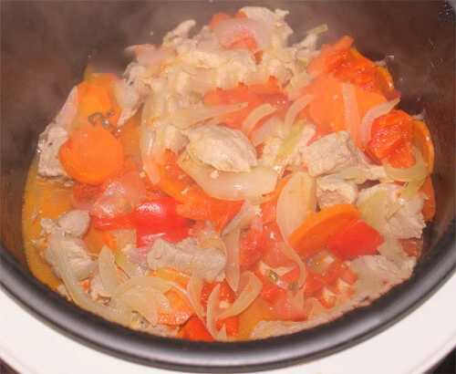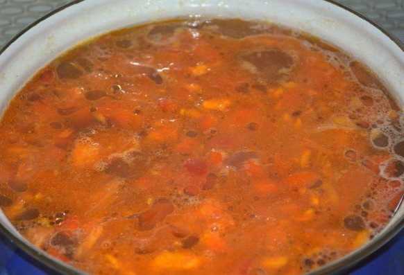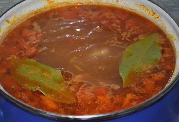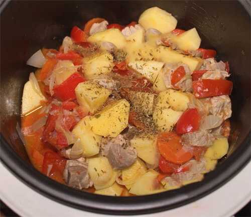 - Giet in water, bestrooi de inhoud met zout en kruiden. We koken het gerecht ongeveer een uur. Voeg 20 minuten voor het koken de tomaten, paprika's en kruiden toe.