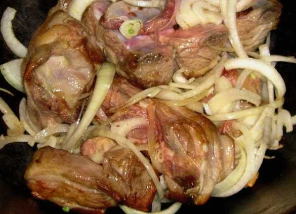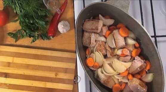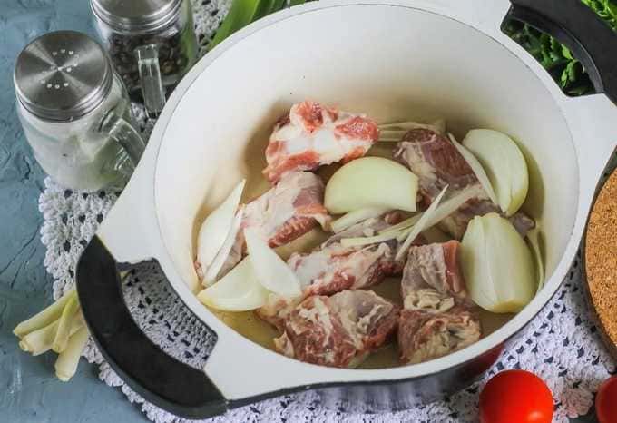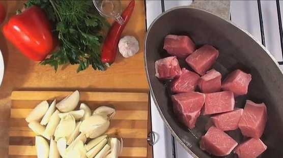 - Verdeel het varkensvlees in gelijke middelgrote stukken. Schil de uien en snij ze doormidden. We doen de producten in een ketel of pan.