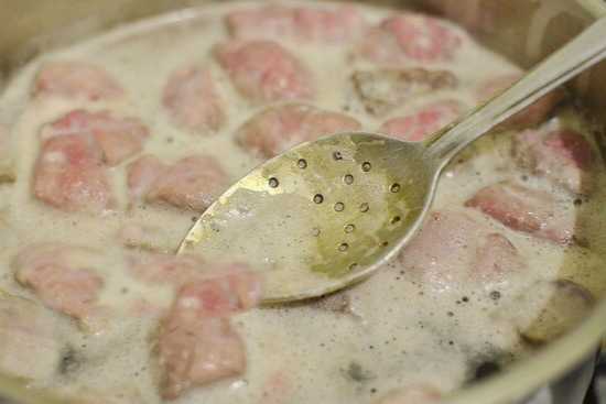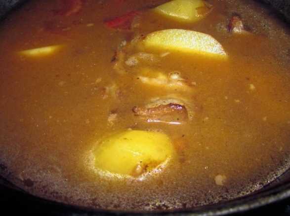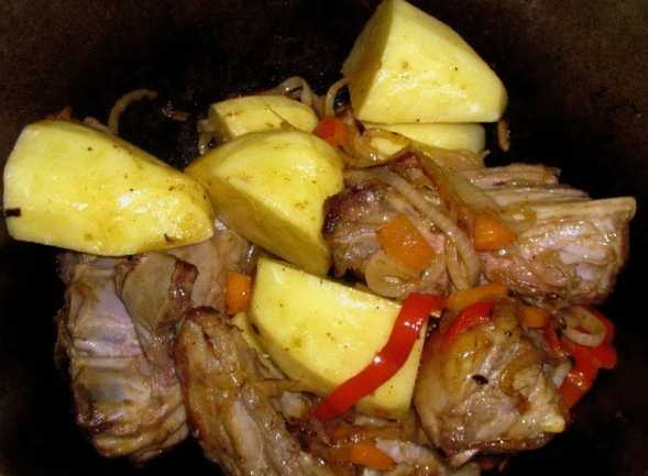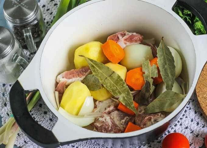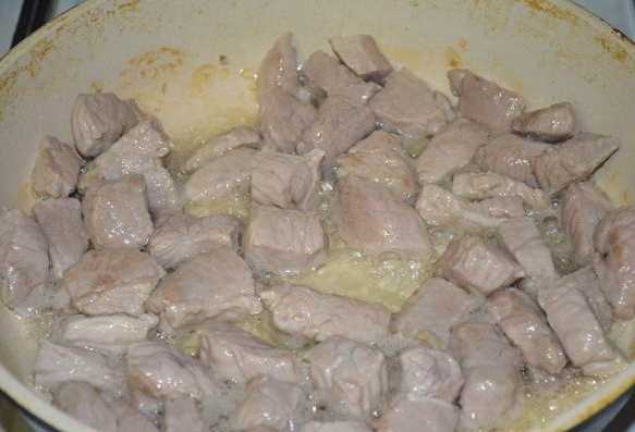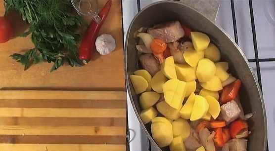 - Dan sturen we het gebruinde varkensvlees samen met aardappelen in een pan, vullen het met water en zetten het op het fornuis.