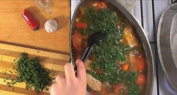 Leg in de laatste fase de gehakte greens neer. Wij regelen de toevoeging van zout en kruiden. Kook het gerecht tot alle ingrediënten zacht zijn.