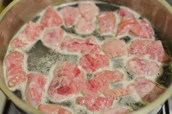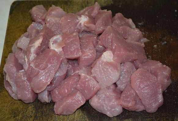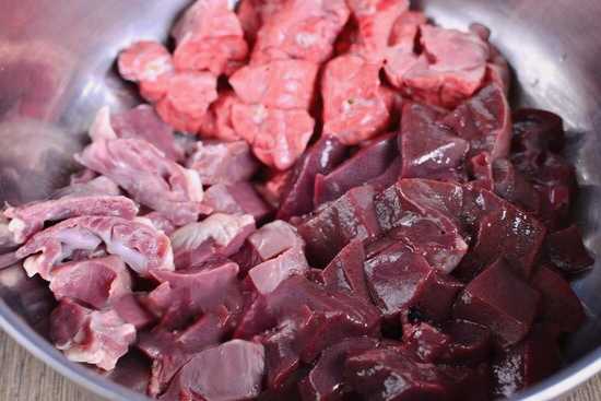 - Laten we het vlees bereiden. Het moet in middelgrote stukken worden gesneden. Bijproducten kunnen naar smaak worden geselecteerd. Bijvoorbeeld hart, lever of longen.