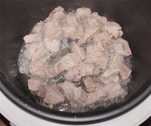 - We wassen het varkensvlees en snijden het in gelijke stukken. We doen ze in een multicooker-kom die is voorverwarmd met plantaardige olie. Koken in de "frituur" -modus gedurende 10 minuten.