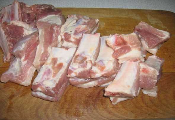 - Giet plantaardige olie in een verwarmde ketel. Leg daar ribben, fijngehakte knoflook en uienringen. Bak gedurende 10-15 minuten tot het bloost.