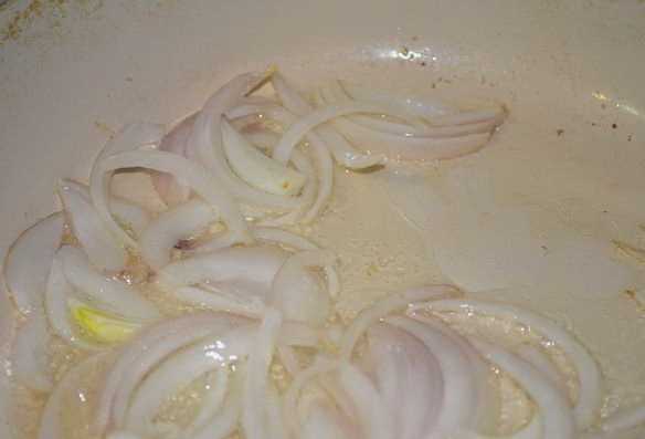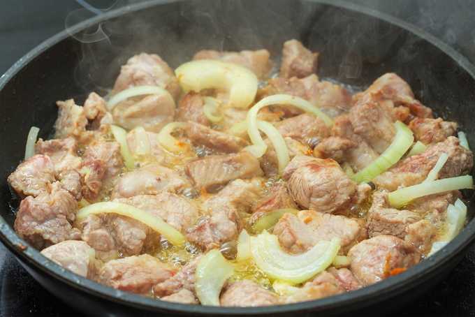 - Snijd de ui in ringen en bak deze samen met het vlees tot het bloost.