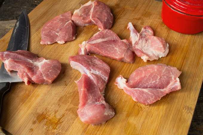 - We verwarmen de ketel met plantaardige olie. Snijd het varkensvlees in grote stukken.