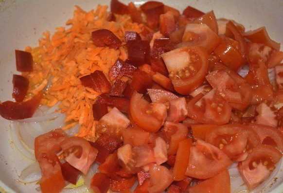 - Voeg vervolgens de rest van de gesneden groenten toe aan de ui: wortelen, tomaten, paprika's. Laat 2-3 minuten sudderen.