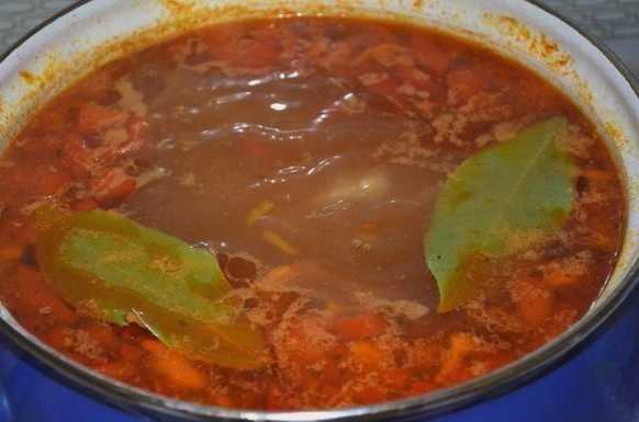 - Combineer gebraden vlees met groenten in een pan. Vul het voer met water. We voegen ook zout, kruiden, laurierblaadjes en tomatenpuree toe. Roer en kook op laag vuur gedurende 1-1,5 uur.