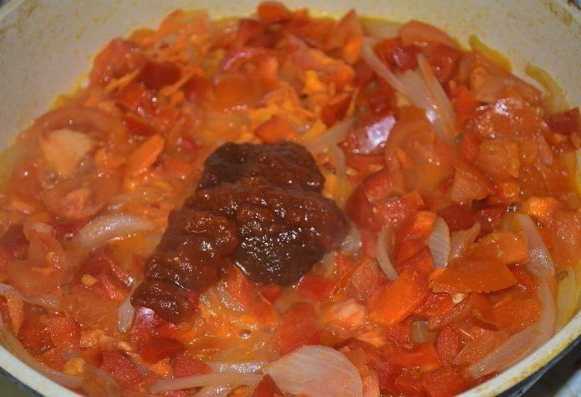- Voeg tomatenpuree toe aan groenten en meng.