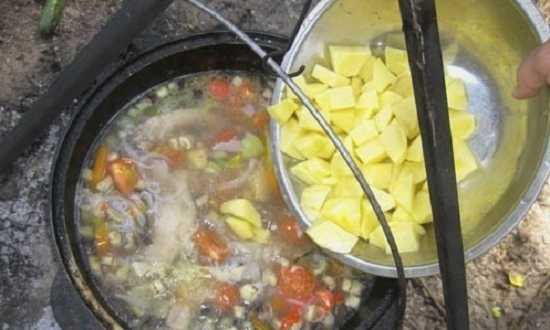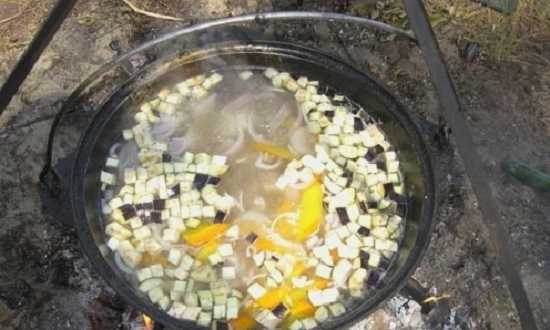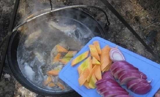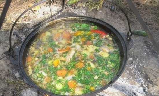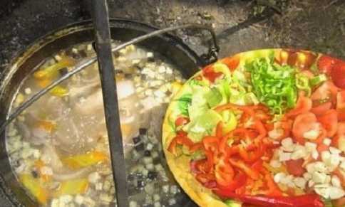 Shurpa gekookt in een ketel boven een vuur blijkt geuriger en rijker te zijn. Door varkensvlees toe te voegen, wordt het gerecht nog rijker en bevredigender. Een geweldige optie voor een geweldige eetervaring in de buitenlucht.