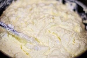 - Klop deze massa met een mixer totdat deze luchtig wordt en in volume toeneemt.