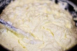 - Meng kwark met eieren, griesmeel en zure room. Voeg een paar eetlepels suiker toe. Maal de massa met een staafmixer. U kunt een gewone stekker gebruiken.