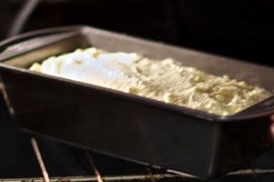 - Doe een zachte massa in een ingevette vorm. Vet de bovenkant in met zure room en stuur hem 50 minuten naar de voorverwarmde oven.