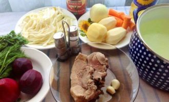 Bereid de producten voor die nodig zijn om te koken: was en schil de groenten, spoel ze, verwijder en gooi de bovenste bladeren van de kool en hak deze fijn, kook de bieten en het vlees van tevoren.