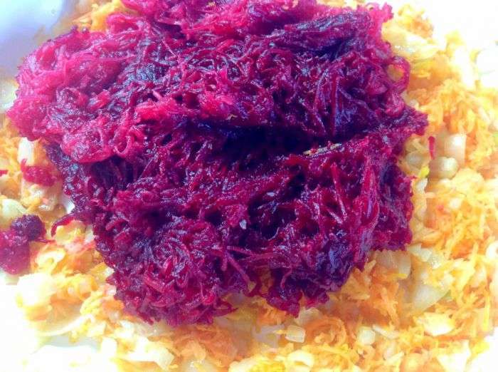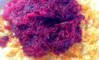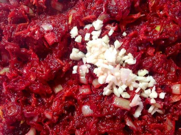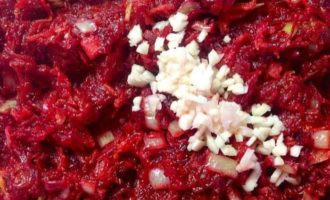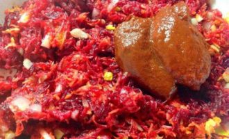 - Schil de bieten, spoel ze af, rasp ze grof of snijd ze in dunne reepjes. Doe in een koekenpan, giet azijn, voeg kristalsuiker, tomatenpuree en vet verzameld uit de bouillon toe. Stoof de bieten onder het deksel tot ze niet helemaal gaar zijn, indien nodig kun je een beetje bouillon uit de pan toevoegen.