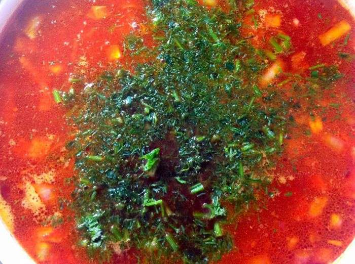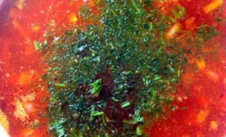 Hak de kruiden fijn, giet het in de borsjt, voeg peper en kruiden toe, roer. Proef de borsjt, voeg indien nodig meer zout toe. Haal de laurierblaadjes uit de pan zodat de soep niet bitter gaat smaken. Klassieke borsjt is klaar.