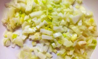 - Hak de selderij en peterseliewortel fijn, schil de wortelen, spoel ze af en rasp ze op een middelgrote rasp. Snijd de ui in halve ringen. Bak de hele massa met de toevoeging van plantaardige olie of reuzel in een voorverwarmde pan goudbruin.