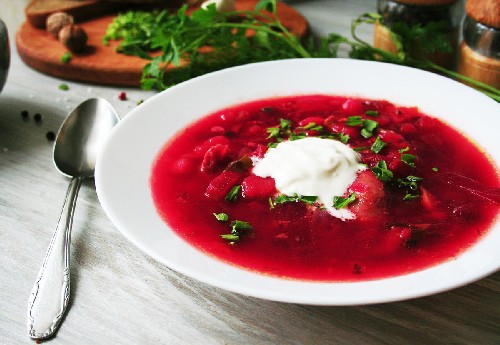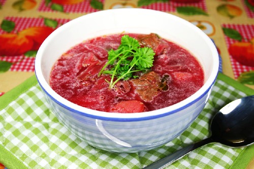 Borsjt gekookt met rood vlees is vooral bevredigend. Het vervangt een volledige maaltijd en verzadigt lang. Alle heilzame stoffen in rundvlees gaan tijdens het koken over in de bouillon en worden snel door het lichaam opgenomen.