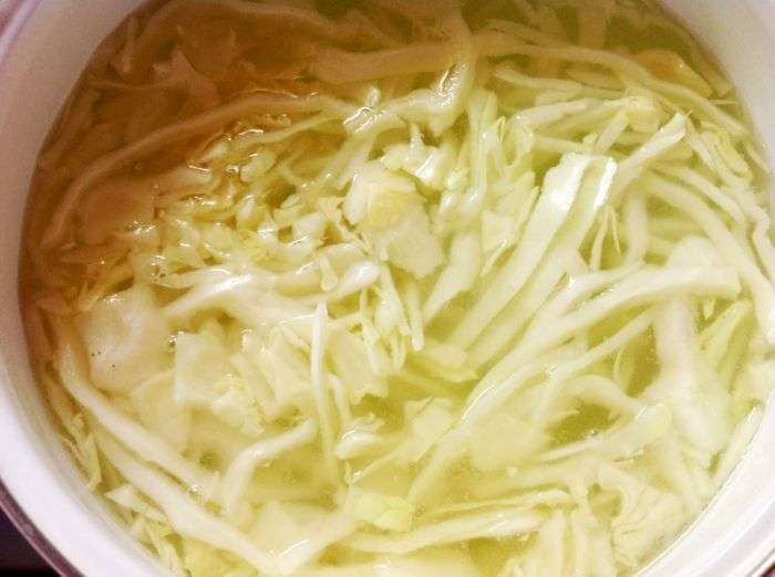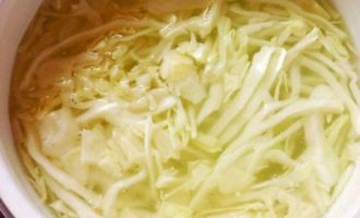 Zet op middelhoog vuur. Stuur de eerder op vlees gekookte bouillon op het vuur. Breng het aan de kook, voeg gehakte kool toe. Zout het water een beetje.