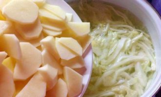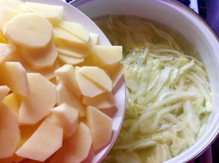 Snijd de aardappelen in middelgrote stukken, doe ze in een pan met de kool en kook ze ongeveer 10 minuten, verwijder het schuim. Laurierblaadjes toevoegen.