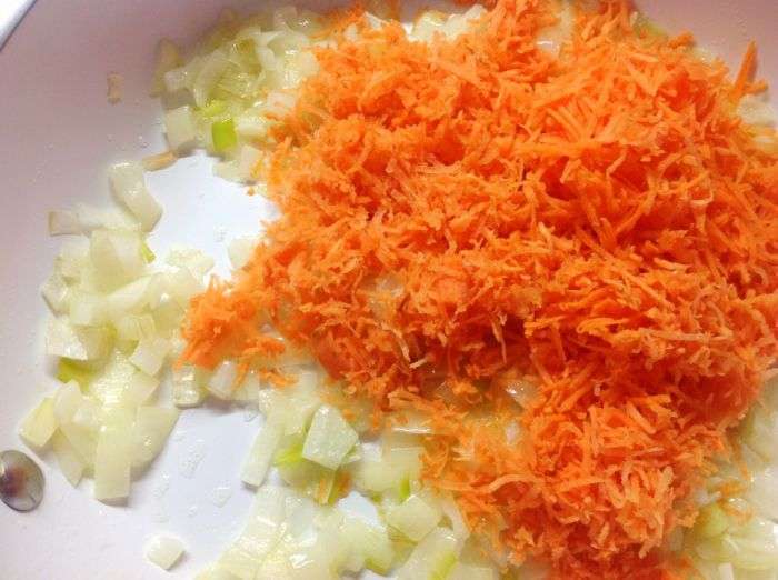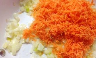 Rasp de wortelen op een fijne of middelgrote rasp, doe ze in een koekenpan met uien.