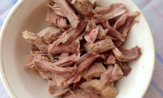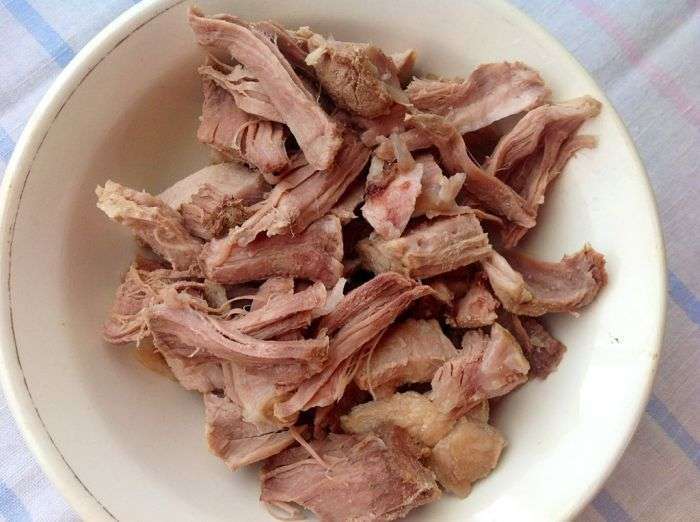 Verwijder varkensvlees (of ander vlees) van botten en verdeel in kleine stukjes.