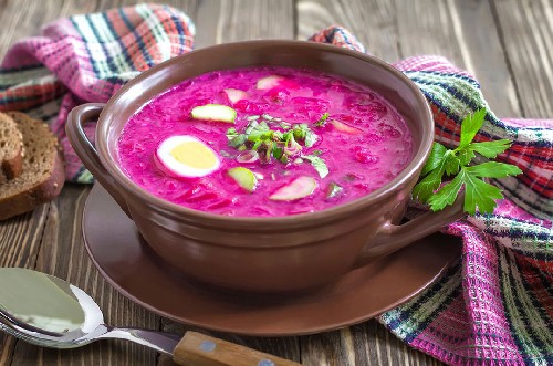 - Klassieke koude borsjt gemaakt van bieten, komkommers en eieren