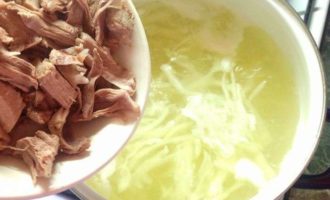 - Als het vlees gaar is, haal het dan uit de soep en verwijder het van het bot, en gooi de ui weg. Snijd de aardappelen in blokjes en giet bij de bouillon.