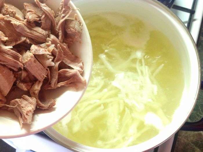 - Als het vlees en de aardappelen in de soep klaar zijn, doe je de frituur erin en kook je nog ongeveer 20 minuten. op laag vuur.