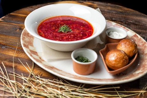 - Serveer het afgewerkte gerecht door het vlees in een bord te snijden, het te vullen met borsjt, zure room toe te voegen en te besprenkelen met vers gehakte kruiden. Leg 3-4 donuts apart op de schaal.
