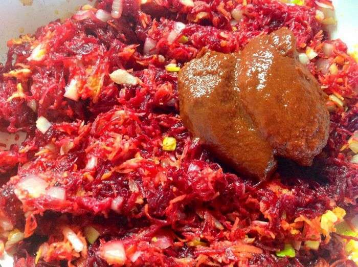 - Rasp de wortelen en bieten grof, hak de paprika fijn in reepjes, snijd de ui in blokjes. Bak alles in plantaardige olie.