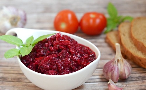 - Doe de bieten in een zeef, laat het water weglopen. Giet geurloze zonnebloemolie in de bouillon, voeg mierikswortel, zout en peper toe. Voeg azijn en suiker toe en probeer met deze bestanddelen de zuurgraad van het gerecht aan te passen.