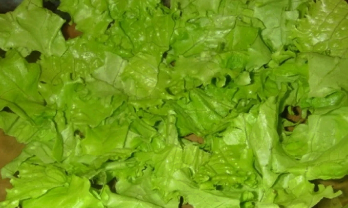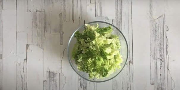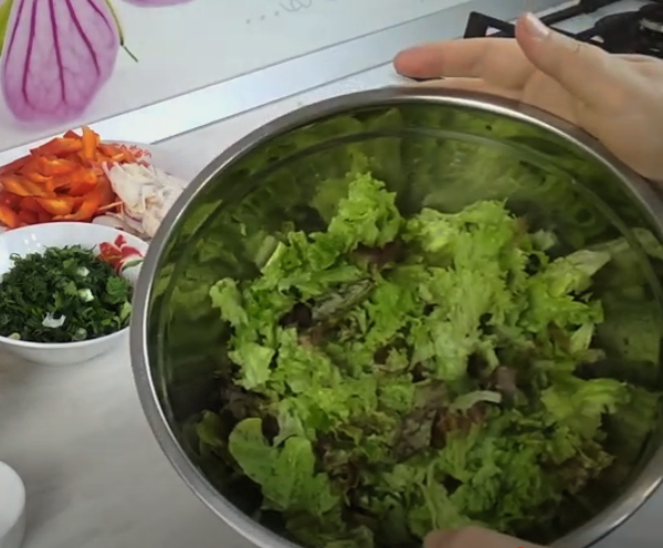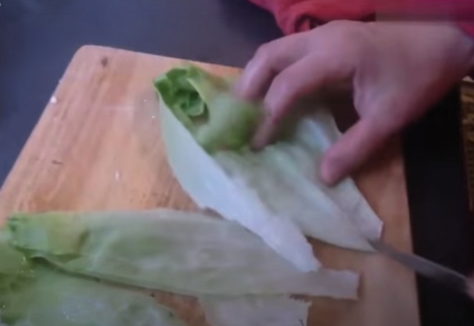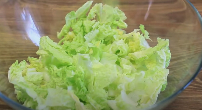 - Was de slablaadjes en snijd ze met de hand in stukken. Als je niet van grote groenten houdt in je voorgerecht, hak de bladeren dan in grove reepjes. Laat een deel van de slablaadjes intact en bedek de bodem van de schaal ermee, waarop de afgewerkte salade zal worden gelegd.