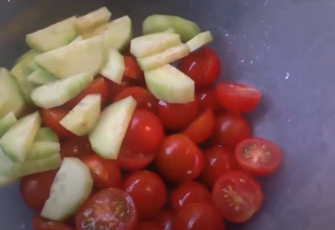 - Combineer komkommers, in repen gesneden, met tomaten.