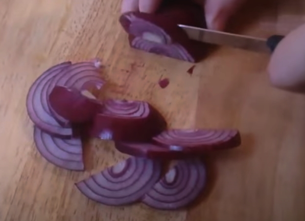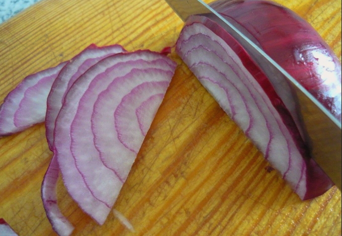 - Snijd de ui in dunne halve ringen. Rode uien hoeven niet voorbehandeld te worden en als je gewone uien gebruikt, moet je de bitterheid wegwerken door ze te weken in een mengsel van azijn en water (1:1).