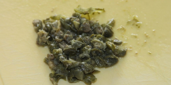 - Snijd de kappertjes in grote cirkels en stuur ze ook naar de slakom.