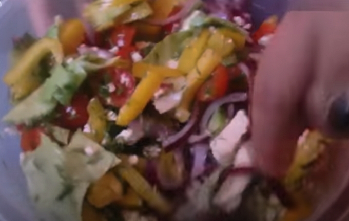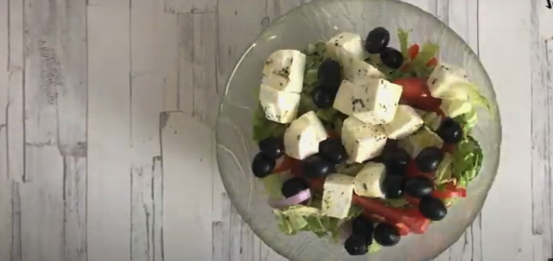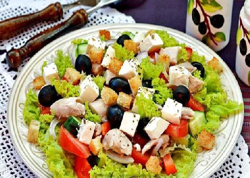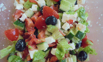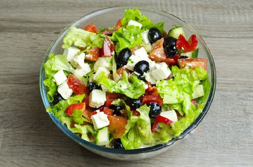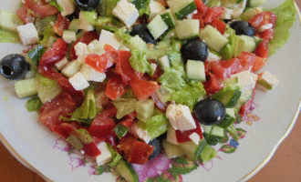 - Meng alle groenten en sla in een diepe kom, voeg de olijven toe en voeg de in blokjes of reepjes gesneden kaas toe. Kruid met peper en zout.